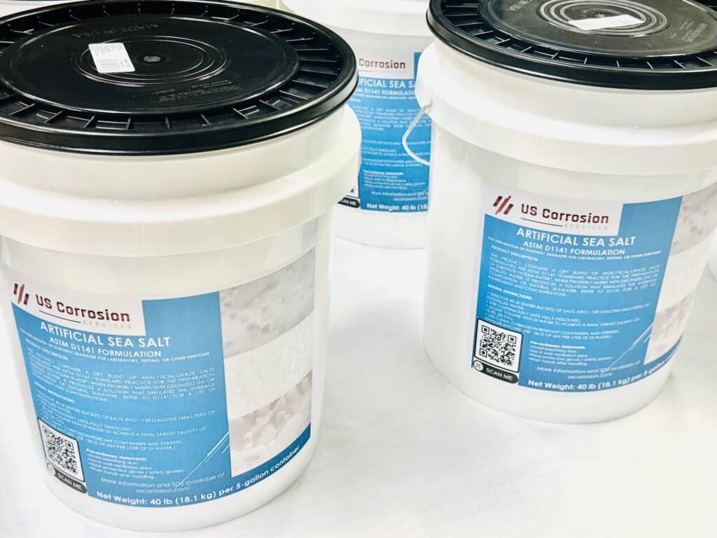 At US Corrosion Services, we understand the importance of accurate and consistent testing environments. That’s why we are proud to offer our ASTM D1141-compliant artificial seawater, meticulously formulated to support your corrosion testing, research, and development needs with unparalleled precision and reliability. We offer a range of sizes, including both liquid seawater and the solid sea salts for making your own liquid, in sizes ranging from 250 grams (about 1/2 pound) to 55 gallon drums. We also make customized blends if needed. Our 50-pound containers start at $395 each and we make shipping and mixing easy!